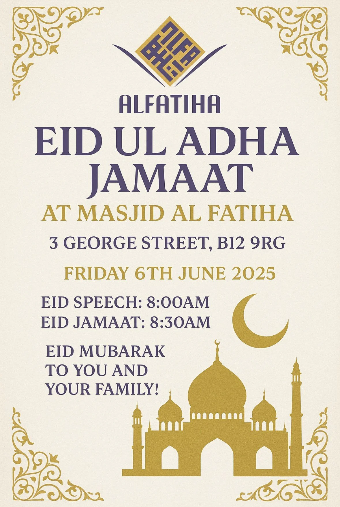 Eid ul-Adha will be celebrated on Friday 6th June 2025. Join us at Masjid Al Fatiha, 3 George Street, B12 9RG for the Eid prayer: