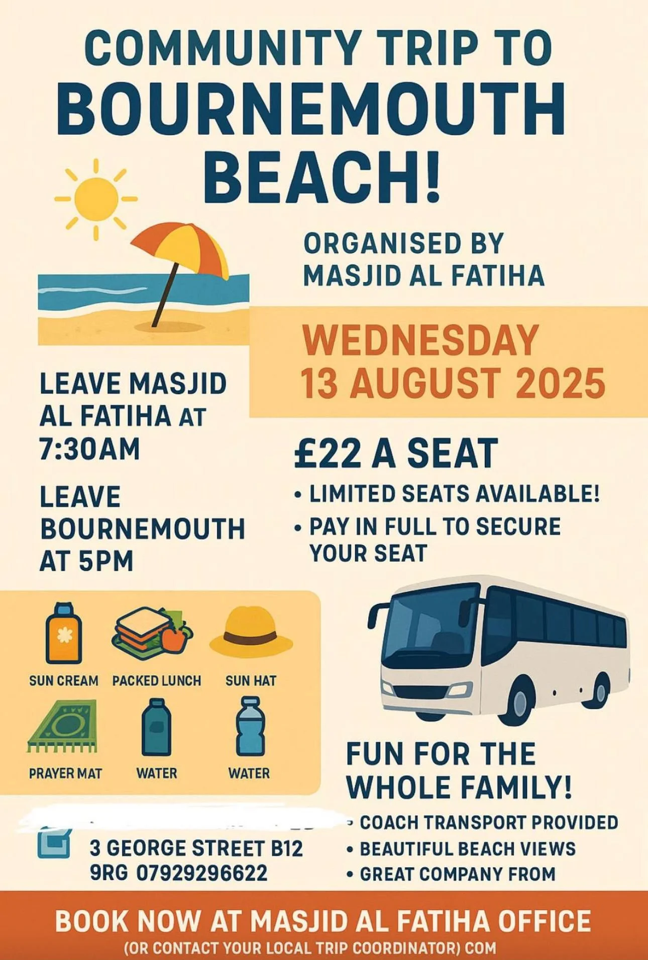 This summer, we’re packing our bags, grabbing our sun hats, and heading for a much-needed day by the sea! On Wednesday 13 August 2025, Masjid Al Fatiha is organising a community trip to Bournemouth Beach – and you’re invited.